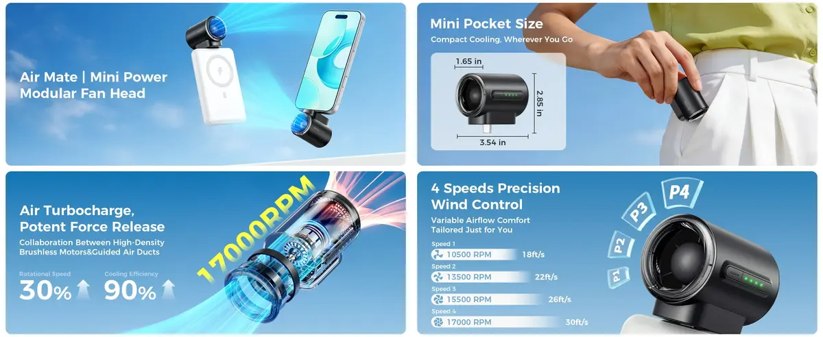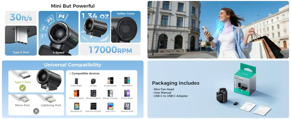 Designed for convenience, the Air Mate is ultra-lightweight at just 38 g (1.34 oz) and small enough to fit in your pocket or bag. Its portable design allows “cooling on demand” without the hassle of carrying a bulky device or worrying about battery life. The fan is powered entirely through USB Type-C, compatible with modern devices like iPhone 15/16/17 series, iPads, Android smartphones, and USB-C power banks. No internal battery is needed, ensuring uninterrupted operation as long as your device has charge.