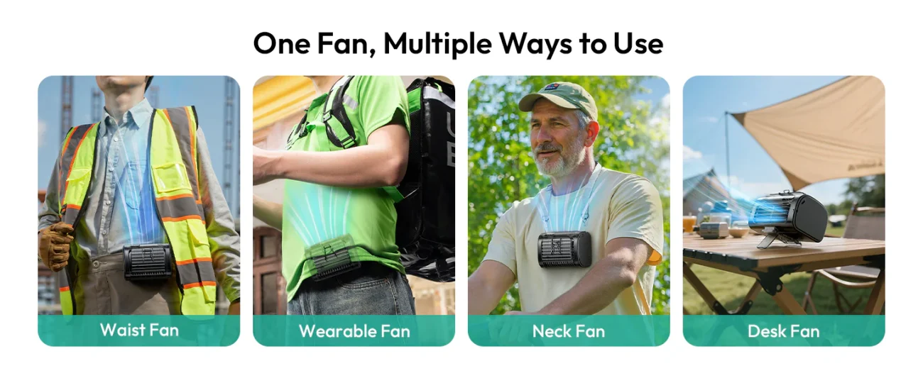 The 4-in-1 wearable design allows multiple modes: clip it to your waist for discreet under-shirt cooling, hang it around your neck for hands-free comfort, hold it in your hand for portable use, or place it on a desk as a mini desktop fan. Additionally, the built-in flashlight with dual brightness and emergency strobe mode ensures safety during night work, camping, or load-shedding situations.