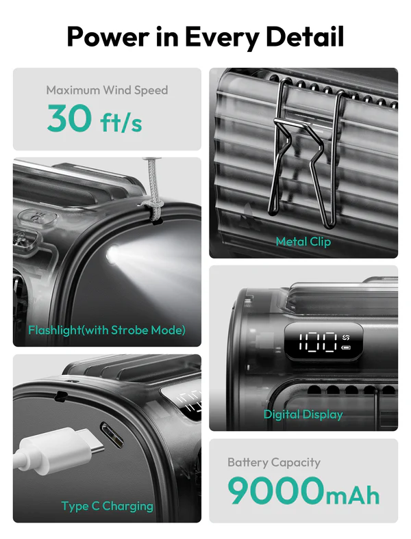 Constructed from durable ABS+PC materials, the fan is lightweight yet rugged, ready to withstand daily wear and tear. With 5-speed adjustable airflow, you can switch between a gentle breeze and a strong cooling wind according to your preference. The universal USB-C fast charging system allows convenient charging via power banks or wall adapters.